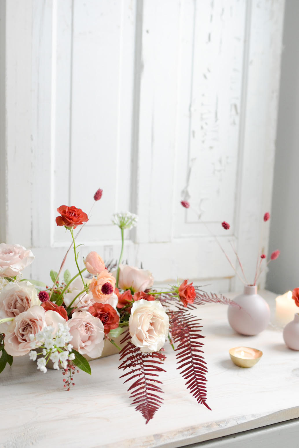 In my early days of designing flowers, I used pepper berries quite often. But I got away from them, finding them bulky. They usually are in a more hanging variety, which weighs more and pulls an arrangment down. They work well for a board accent in an arrangement but there was little else that I used them for. However, these don’t have the drooping habit of the traditional pepperberry and as such, are easier to work with. They still are a great boarder or framing textural accent, but have a little more life and spring to their step. I love the color, it’s blends well with blush, pink, cranberry, red, really any of those tones because there’s almost a speckle on the berry that makes it more of a matte finish and not round a shiny like one might expect a “berry” to be. This speckle makes it less of a solid color and more of a mixture of various shades of rouge.
